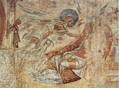 - Parois extérieures aux deux côtés de l'entrée : Annonciation, à gauche l'Archange, à droite la Vierge (fresques déplacées dans un petit local, ne restent en place que les esquisses préparatoires = sinòpia) ;