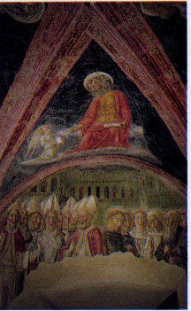 En ces années 40 du XVe s., on discute du problème des hérésies contre le dogme et contre l'institution ecclésiale, ainsi que de l'union entre les Eglises d'Orient et d'Occident. Le cardinal a voulu, dans cette conjoncture, faire de ces fresques un témoignage de sa vie et de sa foi, représentant les vertus et les faiblesses des hommes pour les inviter à suivre la voie juste. C'est pourquoi aussi il adopte parfois des thèmes iconographiques chers à la tradition byzantine (présence des néophytes dans le Baptême du Christ ; ceux qui assistent à l'Annonce à Zacharie, à droite, sont en costumes orientaux semblables à ceux de Jean VIII Paléologue et de sa suite : le couvre-chef rabattu vers le haut ; ceux de gauche sont au contraire en costumes occidentaux = confiance dans l'union du monde en une chrétienté unique).