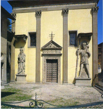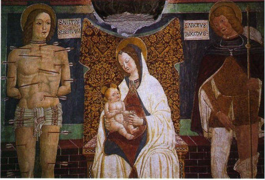 On peut voir ensuite l’église appelée Chiesa di Villa : elle est commencée au contraire plus tard, avant 1437, avec sa voûte hémisphérique, sa coupole conforme à celle de la Sacristie de Brunelleschi à Florence (cf. photo ci-dessus ), dont sont repris sa forme cubique et l’entablement à degrés, tout en gardant des éléments lombards comme les deux gigantesques saints de la façade, S. Christophe et S. Antoine Abbé (détail ci-dessus) attribués à Matteo Raverti (vers 1440). À gauche, fresque d’un inconnu : Vierge entre S. Sébastien et S. Roch.