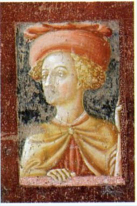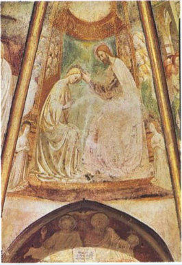 De même la Collégiale offre une façade de briques rouges de pur style gothique lombard (cf. S.Maria delle Grazie à Milan) ; le portail et la rosace rappellent le roman tardif, mais la structure intérieure, les chapiteaux, l'abside, la grâce des arcs ogivaux révèlent un autre style plus proche de Venise, tandis que les sommiers des nefs latérales, les portes latérales et les fenêtres évoquent l'architecture de la Toscane occidentale (Lucques) de l'époque. Ci-dessus, les quatre évangélistes sculptés sur l’architrave du portail : l’aigle (Jean), l’ange (Matthieu), le lion (Marc) et le taureau (Luc), d’un maître lombard auteur également de la lunette au-dessus de l’architrave représentant le cardinal Branda agenouillé devant la Vierge entre les saints Laurent, Clément, Ambroise et Étienne. (voir aussi son portrait par Masolino dans le regard gauche de la fenêtre centrale du chœur, entre les fidèles qui écoutent). Ci-dessous au milieu, Tête de jeune homme de Lorenzo di Pietro. La collégiale est consacrée en 1425, église à trois nefs avec abside polygonale conforme au style lombard antérieur. C’est Masolino qui réalise après 1435 les Histoires de Marie, peintures de pure décoration, considérées souvent comme une involution néogothique (voir ci-contre les figures allongées du Couronnement de Marie et de l’Annonciation, sur des fonds qui s’adaptent aux calottes de la voûte).