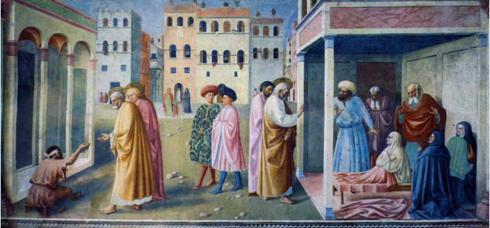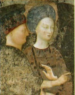- Sur la paroi intérieure correspondante, Annonce de l'ange à Zacharie derrière la Vierge, et la Visitation derrière l'Archange = représentation courante en Orient. Masolino met en opposition l'acceptation de la Vierge et l'incrédulité de Zacharie, et en parallèle la Vierge et Elisabeth. À travers l'entrée, entre l'Ange et la Vierge, on voit l'autel où on célèbre l'eucharistie et le mystère de la Rédemption est donc contemplé à travers la représentation de l'Annonciation.