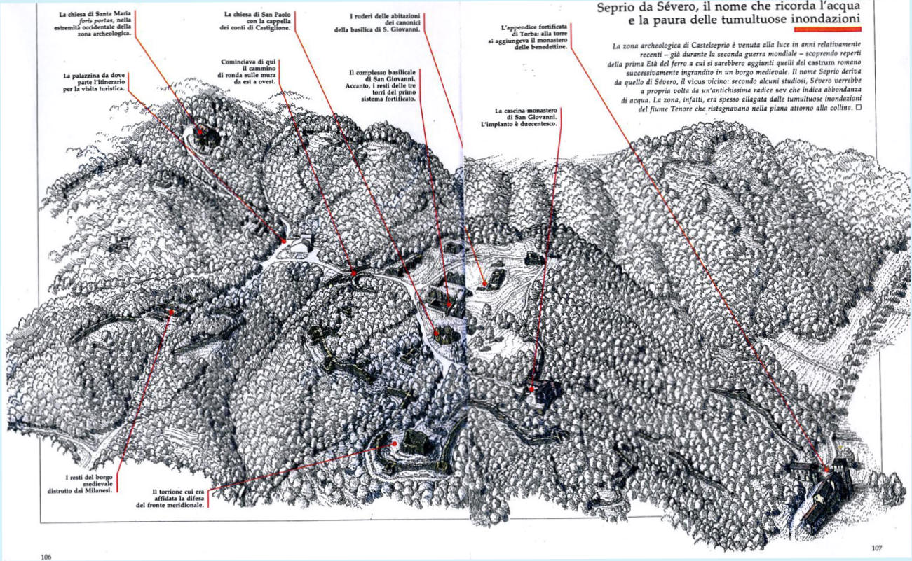 On traverse le village actuel de Castelsèprio et on accède au Parc archéologique : restes du château et de l’enceinte fortifiée qui entourait le lieu sur 900 mètres et dont un appendice incluait le monastère de Torba. À l’intérieur de l’enceinte (on peut suivre le cours des murailles, parfois interrompu), bases de 4 tours préexistantes du IVe s. (dont la tour I a été réutilisée comme clocher de la basilique S. Jean) ; ruines de la basilique S. Jean l’Évangéliste (Ve - VIIe s. Il en reste les murs latéraux et l’hémicycle de l’abside. Elle était complétée par un baptistère octogonal doté de fonts baptismaux octogonaux pour le baptême par immersion, comme ceux de Varese : le nombre 8 était depuis Pythagore un symbole d’éternité, et pour les chrétiens, le 8e jour était celui qui dépassait le rythme du temps, des 7 jours de la semaine, et introduisait à l’éternité de Dieu, or le baptême représentait une descente dans l’eau et une résurrection qui faisait entrer dans la vie éternelle ; à côté une vasque circulaire pour les baptêmes par infusion. On accédait à l’église à travers un narthex ; à droite, restes d’une grande citerne de 5 à 6 m. de profondeur. On peut distinguer les quartiers du castrum dont peu d’édifices ont été fouillés. En face du côté droit de la basilique, murs de l’église Saint Paul, hexagonale et couverte de voûtes, édifiée par les comtes de Castelsèprio au XIIe s. et détruite entre 1810 et 1857 pour en récupérer les pierres. L’église était hexagonale, en référence aux 6 jours de la Création, et au caractère trinitaire du Christ (contre la théorie arienne). À l’Est de l’enceinte, la « cascina » (ferme) Saint Jean, couvent des Frères Humiliates puis des Franciscains au XVe s., elle devient propriété d’un Père Ascensionniste français sous Frédéric Borromée, puis d’une famille milanaise.