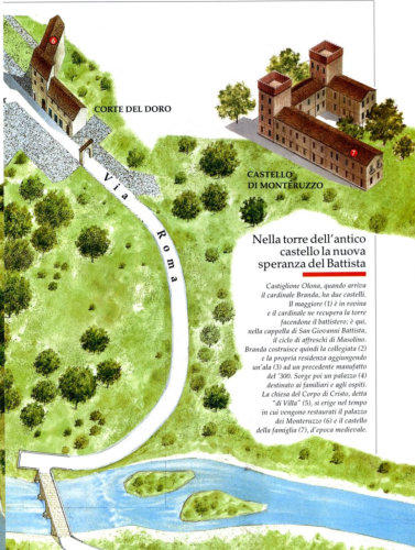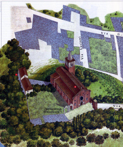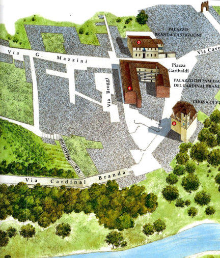 n 1423, par décret ducal, le cardinal Branda Castiglioni (1350-1443), légat pontifical originaire de Castiglione, comte et évêque de Veszprém (Hongrie), ami de l'Empereur Sigismond de Luxembourg et de Côme de Médicis l'Ancien, entame un grand programme de constructions : la Collégiale des Saints Etienne et Laurent (1422-25, par les « maîtres de mur » Alberto, Giovanni et Pietro Solari), l'Eglise du Très Saint Corps du Christ (« di Villa », 1431-44), une Ecole de grammaire et de chant (aujourd'hui Mairie), un asile de pauvres, parallèlement à de nouveaux palais nobiliaires, faisant appel à de grands artistes toscans, dont Masolino da Panicale. Le cardinal Branda fut une grande figure de la Renaissance, promoteur de l'instruction scolaire, brillant orateur et prédicateur, habile diplomate, mécène des humanistes, ouvert à tous les courants de l'art vénitien, toscan et européen. Vespasiano da Bisticci, le père de l'industrie de l'édition, lui consacre une Vie en 1482. « Le projet répond au désir humaniste de créer un centre de spiritualité et de culture ; refuge idéal dans lequel faire converger tous ses intérêts » (Arte nel tempo , p.116).