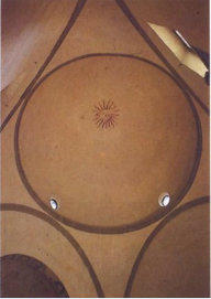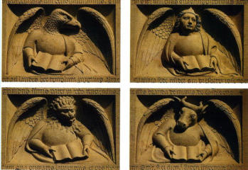 - Dans la voûte ogivale, l'Agneau de l'Apocalypse au centre, entouré de S. Jean l'Evangéliste dans la calotte correspondant au Baptême du Christ ; S. Mathieu ( = l'évangéliste qui voulut démontrer l'identité entre l'Eglise du Christ et le règne de Dieu) est représenté au-dessus de la Ville Eternelle ; S. Luc (le seul à raconter la naissance de Jean) est dans la calotte septentrionale ; S. Marc (qui raconte beaucoup de détails sur le martyre de Jean) est représenté sur l'épisode du Banquet d'Hérode.
