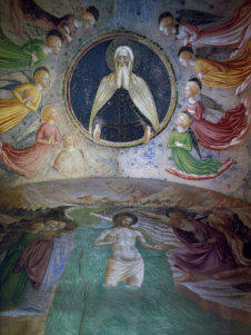 - Dans la voûte en berceau, au-dessus du Baptême du Christ, le Père éternel, bras ouverts au-dessus de l'autel où est célébrée l'eucharistie = affirmation de la transsubstantiation au moment où elle était niée par les Hussites de Bohême et de Moravie (où le cardinal Branda avait été envoyé comme ambassadeur pour combattre l'hérésie). En-dessous, Reproches de Jean à Hérode (inscription : « Non licet tibi habere uxorem fratris tui adulteram ») et Rencontre de Jean avec le Christ. Remarquer là encore le face-à-face : Rencontre avec le Christ / Visitation (= rencontre des mères) ; Reproches à Hérode / Annonce à Zacharie (= faiblesse humaine qui entraîne l'homme au péché).