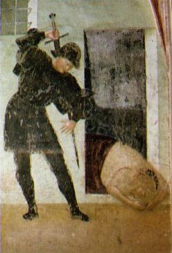 - Dans la lunette du Palais où est enfermé Jean, bas-relief avec Adam et Eve au travail = conséquence du péché originel. Suit la Décapitation de Jean, qui précède le Banquet d'Hérode qui occupe toute la paroi Sud dans une architecture somptueuse : Salomé se présente pour demander la tête de Jean et à droite elle remet la tête de Jean à Hérodiade.