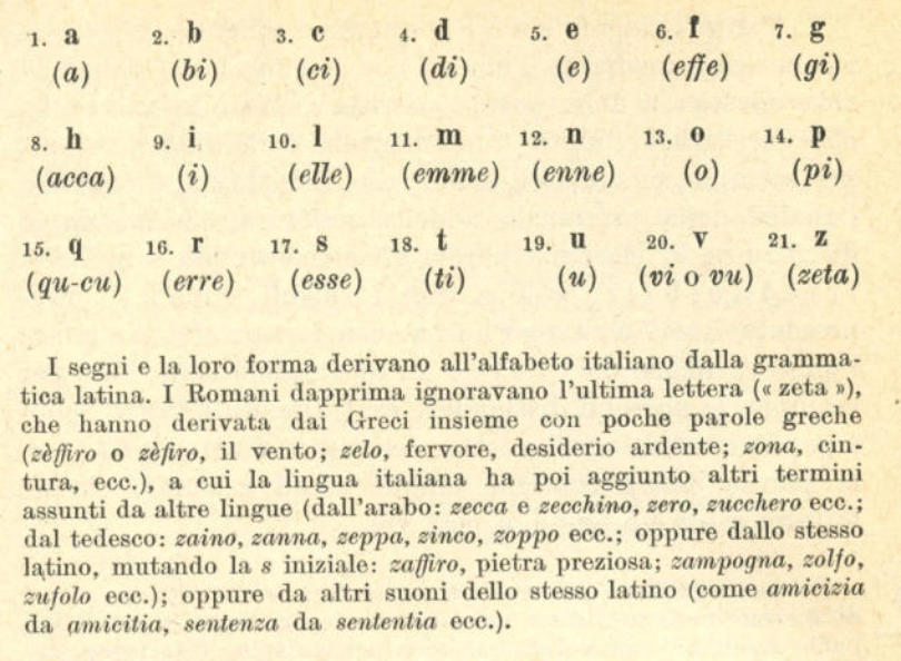 Les lettres k (cappa), w (vou doppio), x (icsé), y (ipsilon) ne se trouvent que dans des mots étrangers. Le k est
