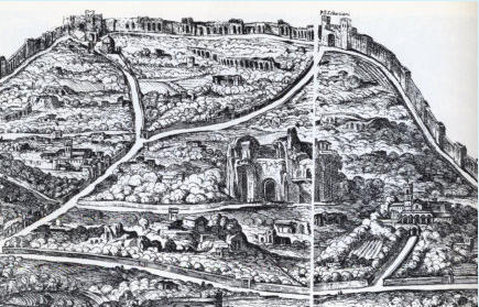reconstruites dans les décombres des monuments anciens, et une masse de décombres d’où émergent des colonnes, statues, arcs,