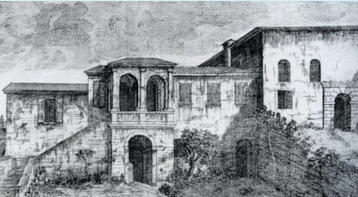 décorée d’élégants ordres ioniques, tandis que les bâtiments de service