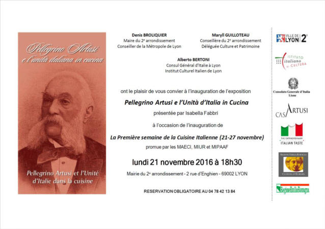 Inauguration de l'exposition "Pellegrino Artusi et l'Unité d'Italie en cuisine"L’Institut Culturel Italien de Lyon et le Consulat Général d‘Italie à Lyon sont très heureux de vous inviter à l’inauguration de l’exposition Pellegrino Artusi et l’Unité d’Italie en cuisine, qui aura lieu lundi 21 novembre à 18h30 à la Salle Camille Georges de la Mairie du 2e arrondissement de Lyon, dans le cadre de la 1ère Semaine de la Cuisine Italienne dans le Monde.Durant cette semaine, auront lieu également :- la présentation du livre Cucina all’ Opera du Prof. Isabella Fabbri, le mardi 22 novembre à 19h00 auprès du Loft du Goethe Institut (18 rue François Dauphin - Lyon 2e)- la projection du film La Cena , de Ettore Scola, le mercredi 23 novembre à 19h00 auprès du Loft du Goethe Institut- et la conférence « Pregiatissimo Signor Artusi » : le parole e la cucina di Marietta per costruire un capolavoro , donnée par le Prof. Giovanna Frosini, jeudi 24 novembre à 18h30 à la Mairie du 2e arrondissement de Lyon.