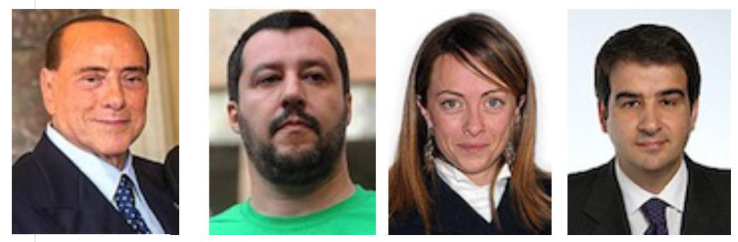 I leader di centro destra : Silvio Berlusconi (Forza Italia), Matteo Salvini (Ligue), Georgia Meloni (Fratelli d’Italia), Raffaele Fitto (Unione Centro