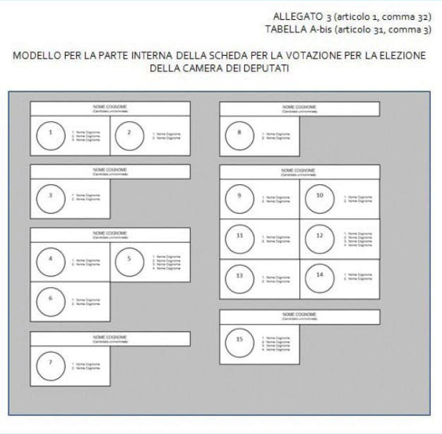 La loi, valable pour la Chambre et pour le Sénat, prévoit deux types de collèges : 37% de collèges uninominaux majoritaires (232 sièges) et 63% de