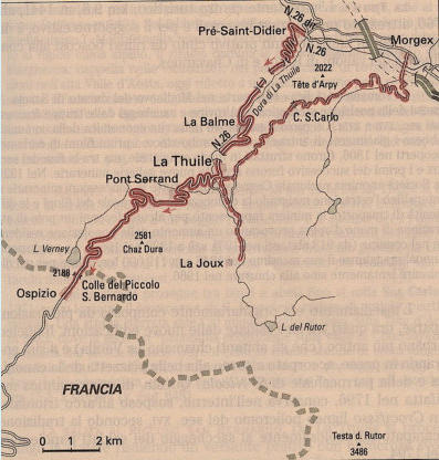 Avant d’arriver à Aoste, notons qu’à Pré-Saint-Didier et à Morgex aboutit la route qui vient de France par le col du Petit-Saint-Bernard. Avant le col, on passe le