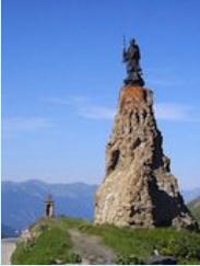 Monument à Saint Bernard, en bronze, de 1902, et sur le sentier qui le longe, l’ancienne guérite des douaniers « des quatre vents » (orientée selon les 4 points