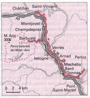 de Montjovet, creusée par le fleuve, lieu stratégique qui a toujours commandé l’accès à Saint-Vincent, puis Aoste. La