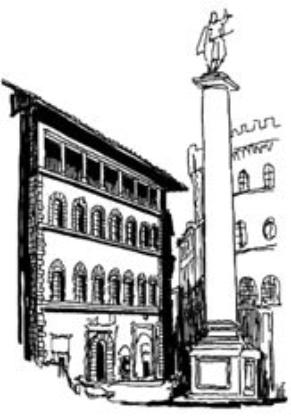 En face de l’église, à g : Palais Bartolini-Salimbeni (Baccio d’Agnolo, 1517-23), avec niches et colonnes flanquant les