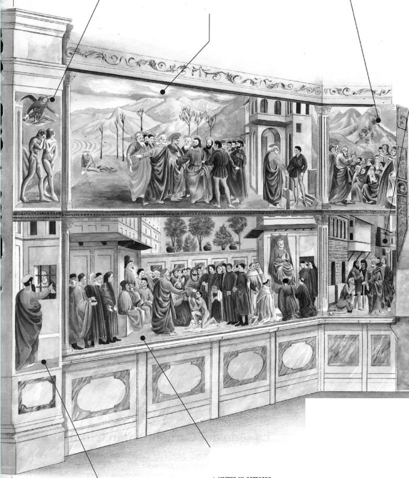 L’ensemble retrace l’Histoire du Salut, opéré par le Christ quirachète les hommes du péché originel, et que l’on atteint parl’intermédiaire de l’Eglise de Rome fondée par S. Pierre. Lesépisodes de la vie de Pierre sont tirés des Actes des Apôtres.D’autres fresques de la voûte et des lunettes ont été détruites auXVIIIe s.