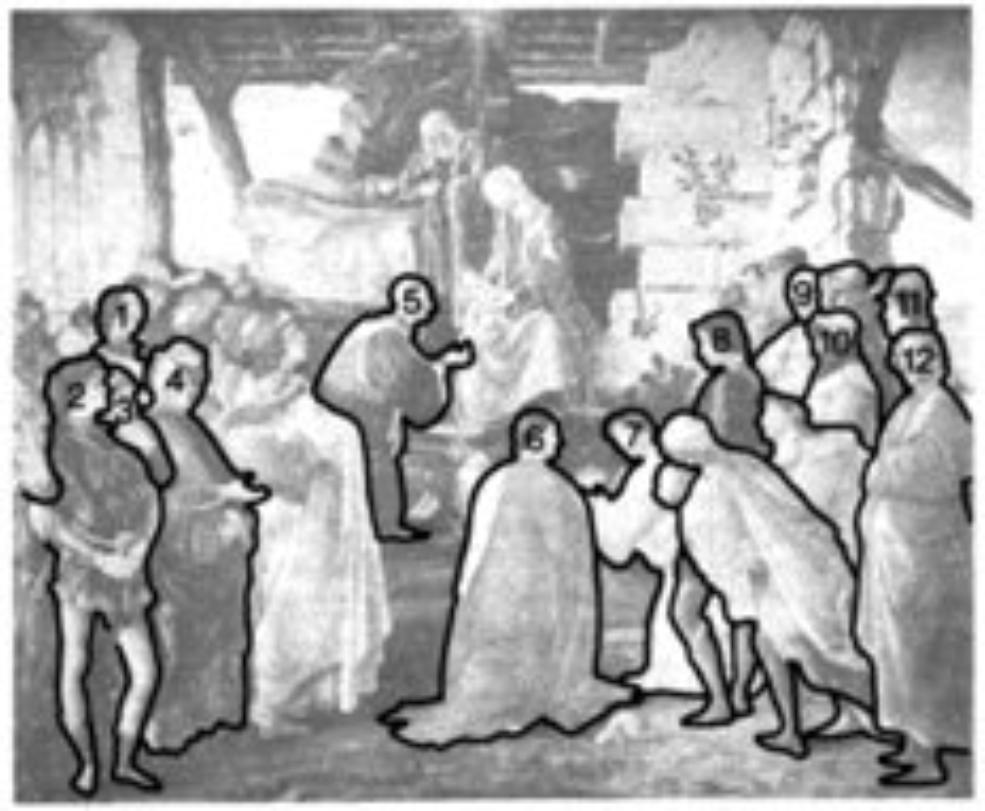 Identification probable des personnages1) Le commanditaire, Gaspare Lami(2) Lorenzo il Magnifico(3) Angelo Poliziano(4) Pico della Mirandola(5) Cosimo il Vecchio(6) Piero il Gottoso(7) Giovanni de’ Medici(8) Giuliano de’ Medici(9) Filippo Strozzi ?(10) Giovanni Argiropulo(11) Lorenzo Tornabuoni(12) Autoportrait de Botticelli