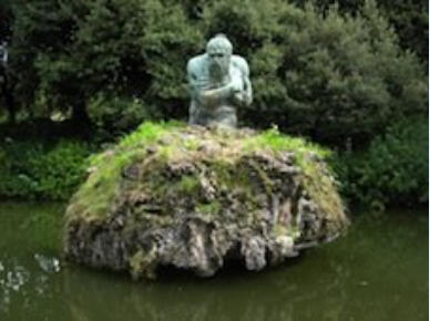 parvient finalement à un grand bassin, au centre duquel surgit sur un îlot rocheux, la statue de bronze d'un vieil