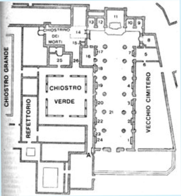 dons des grandes familles florentines dont les tombeaux (avelli) se trouvent dans l’ancien cimetière et sous les arcades du mur d’enceinte, sur la place et dans la