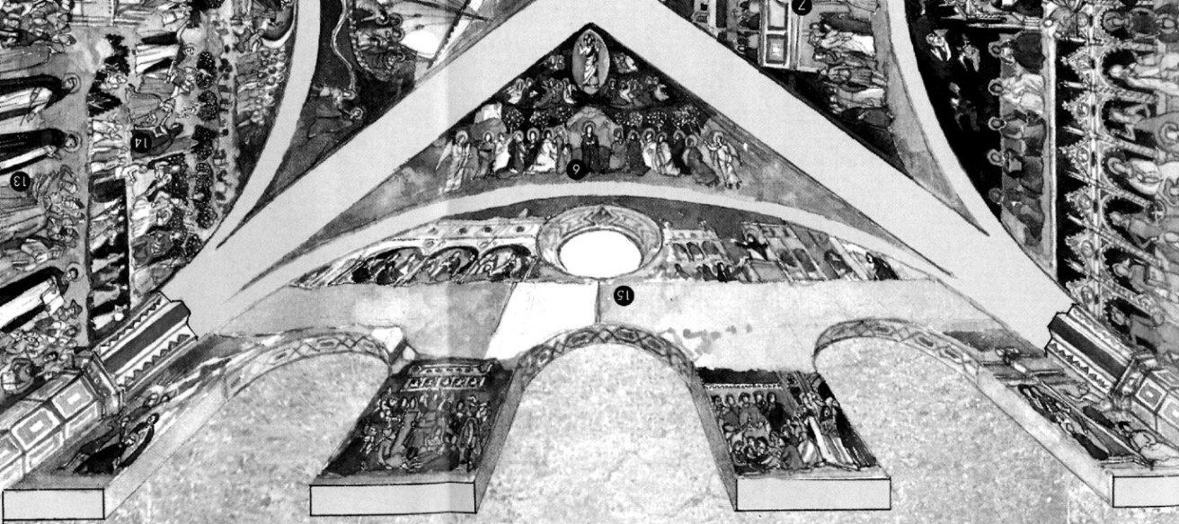 ecclésiastique (cf. par exemple les rouleaux avec inscriptions et les figures d’Evangélistes et de Pères de l’Eglise qui ornent les bandes de séparation des