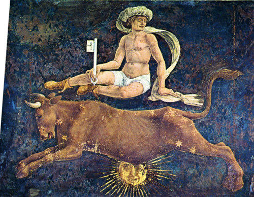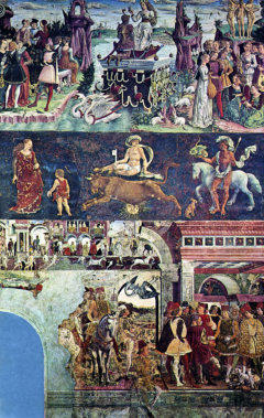 la vie de cour sous Borso d’Este ; au milieu les signes du zodiaque qui correspondent à chaque mois, entourés par 3
