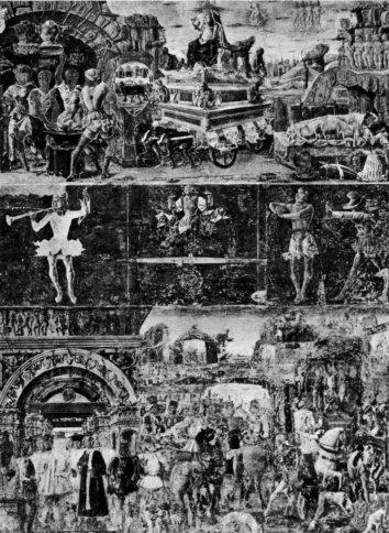 restent intactes, divisées en 3 bandes horizontales : en haut les divinités sur des chars de triomphe, en bas des scènes de