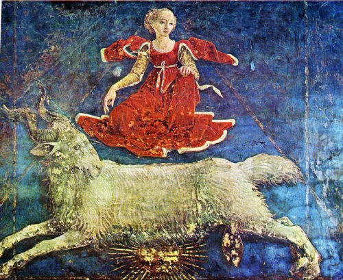 Ci-dessus : Mars, signe du Bélier. À dr. : Avril, Borso et le bouffon Scocola.