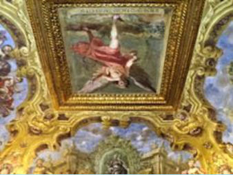 Voûte : au milieu de l’or des stucs, fresque des Mystères de la passion et de la mort de Jésus