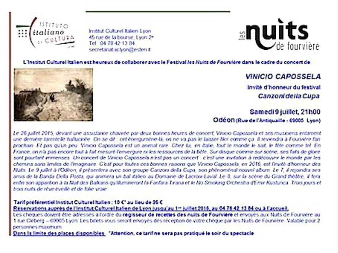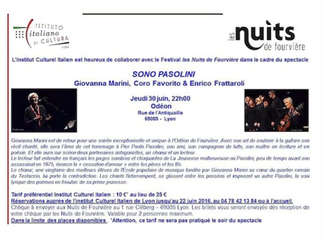 Si vous êtes adhérents de l’Institut Culturel Italien de Lyon, voyez ci-dessous la possibilité d’obtenir des billets à prix réduit.