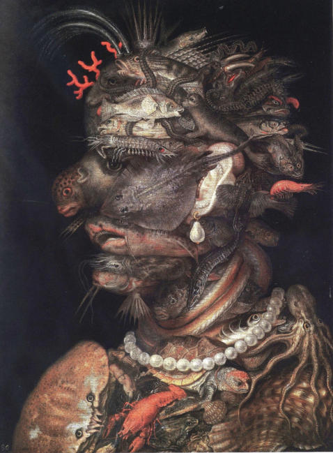 Giuseppe Arcimboldo, L’Acqua, de 1566, maintenant à Vienne, une tête constituée de 62 images de poissons, d’invertébrés et de