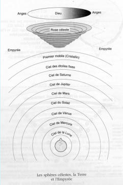 cristallin, l’Empyrée, immobile, les 9 cercles de la rose céleste où sont les élus du Paradis, puis Dieu et les 9 cercles d’Anges).