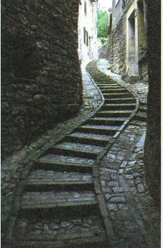 Anne consacrée à l’accueil des pèlerins. Au bout de la rue, à g., les chaînes de délimitation du