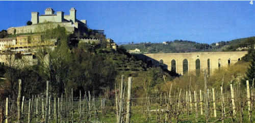 anciens. Dans la courbe, très belle vue du Monteluco surmonté d’une croix. On arrive au Ponte delle Torri (ci-contre)
