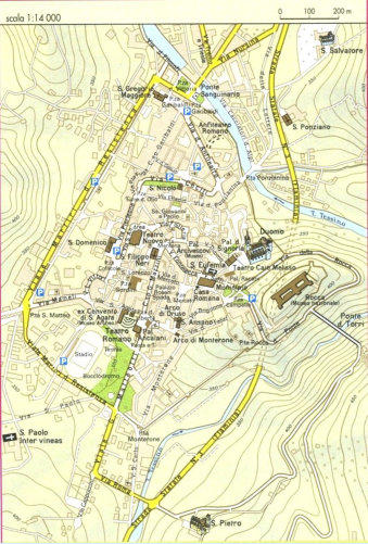 s.). La rue se termine par piazza S. Ansano, où la via Flaminia en provenance de Rome arrivait en passant sous l’Arc de Monterone (porte romaine du IIIe