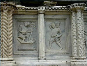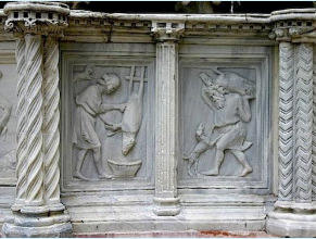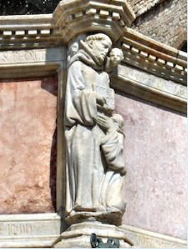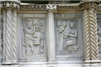 son horloge. Puis on trouve le Portale Maggiore (Grand portail) de 1346, flanqué de deux pilastres reposant sur des lions ; celui de gauche porte les allégories