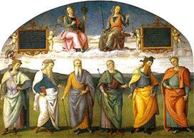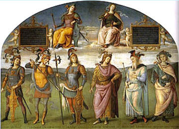 Perugino, avec une inscription qui fait allusion au débat sur la supériorité des Anciens ou des Modernes (Ci-contre à gauche).
