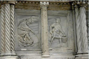 ont les pattes sur des veaux, symbole de la Corporation des bouchers qui avaient financé la construction ; dans la lunette les saints Laurent, Ercolano et