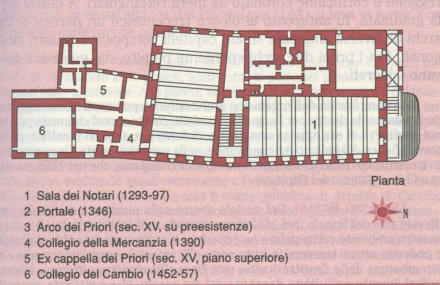 Limosino Benedictioli, et la chapelle de San Giovanni devient le Collegio del Cambio (n° 6 du plan) à partir de 1429. En 1443, les