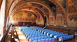 À droite, se trouve la Salle des Audiences, centre de l’activité commerciale de la corporation, dont les lunettes sont peintes de fresques de