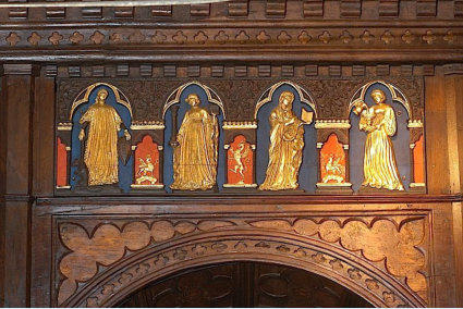 en bas-relief, la Prudence (sagesse), la Force (courage), la Justice et la Tempérance (modération), les 4 vertus