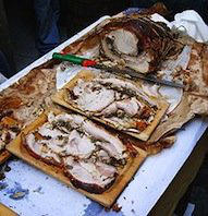 Mais le plus caractéristique est le porc. Mangez de la Porchetta (cf. photo de droite) : le porcelet est rôti après qu’il ait été rempli de fenouil (il finocchio) et