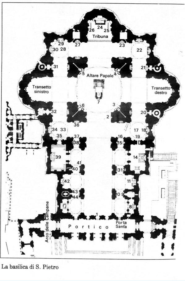 Pour des raisons liturgiques et pour occuper tout l’espace de la basilique primitive, Paul V (1605-21) imposa finalement la croix latine et Carlo Maderna ajouta 3