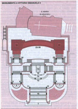 Fontaine de la Mer Tyrrhénienne ; 8) Le Sacrifice ; 9) Le Droit ; 10) Grand escalier ; 11) et 12) Victoires sur Rostres ; 13)