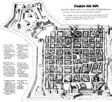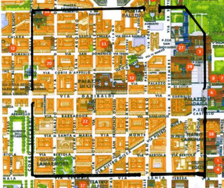 Domenico à g., et de « cardines » mineurs = rues Stampatori et Botero à dr., rues Delle Orfane et Milano