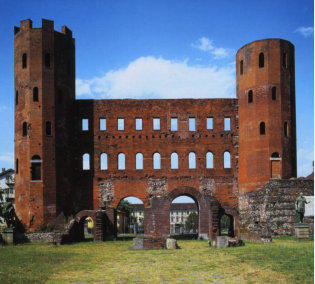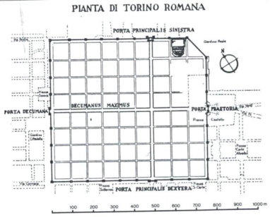 « cardo » (voie Nord - Sud) = Via Porta Palatina, d’un « decumanus » (voie Est - Ouest) = Via Garibaldi,
