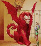 La manticora = La manticore, sorte de chimère dotée d’une tête humaine avec un corps de lion rouge et une queue de